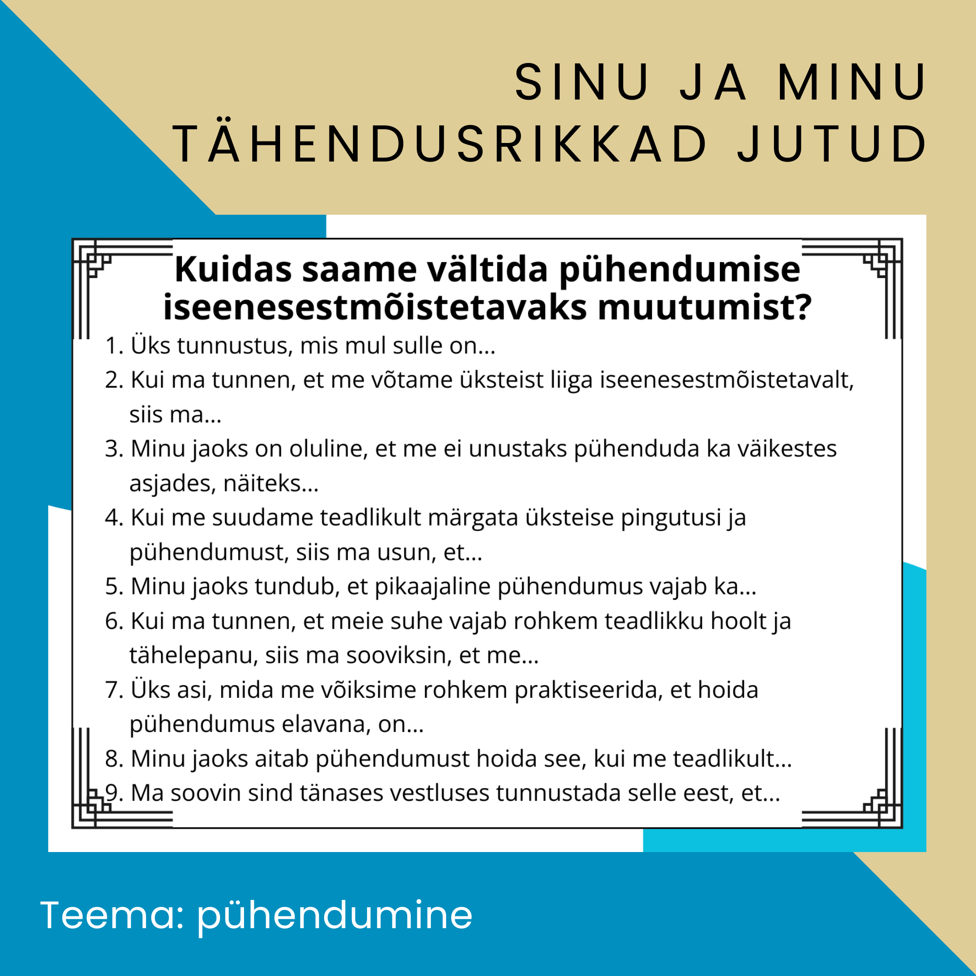 Dialoogide struktuur hoiab turvalist ruumi – lausealgused aitavad rääkida ilma süüdistuste ja kaitseta.